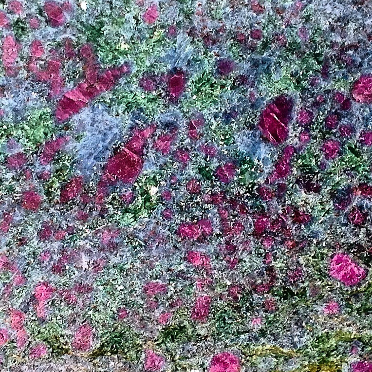 Robijn komt nog goed herkenbaar in andere gesteenten voor. Hier is het basisgesteente Fuchsiet, Soms is er nog een blauw laagje om de Robijn te zien. Dit is Kyaniet.   Beiden zijn aluminium Silicaten. Bij het ontstaan vreet de 1 de ander op. Voorbeeld is een detailfoto.
